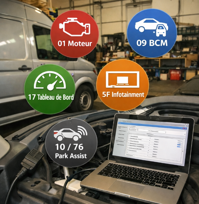 Grâce à VCDS, vous pouvez débloquer des fonctions cachées sur votre Volkswagen Crafter SY : confort, affichages moteur, sécurité, éclairage LED, radar, caméra de recul, climatisation sur écran et bien plus. Voici la liste complète de tous les codages connus.