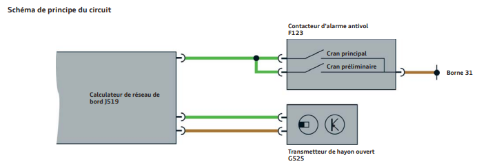 Le calculateur du réseau de bord J519 évalue non seulement l’état de commutation de ces deux contacteurs, mais analyse également le temps écoulé entre les signaux provenant des deux capteurs. Si, lors de la fermeture du hayon, le décalage temporel entre les deux signaux est trop important, les feux arrière supplémentaires restent allumés pour des raisons de sécurité.